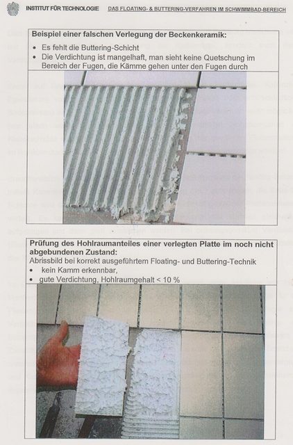 Gemeint ist das Fliesenhandwerk - nicht im Allgemeinen – sondern, wie in diesem Härtefall, bisweilen im Speziellen. Wie zu lesen, hat man in einem großen Hallenfreizeitbad über ca. 1000 m² mangelhaften Fliesenbelag im Schwimmbecken- Umgang entfernt um euphorisch ein neues Sanierungs-Verfahren als Problemlösung zu realisieren. Um den als Corpus Delicti bauphysikalisch schadensursächlich georteten Wasserdampf im Fliesenbelag künftig nachhaltig zu verhindern respektive zu beseitigen sollte nunmehr im Nassraum-Feuchtgebiet zusätzlich flächendeckend eine atmungsaktive Drain- und nicht Dröhn-Matte im Fußbodenaufbau mit integriert werden. Zugegeben. Möglicherweise eine DIN verdächtige Underground-Sonderkonstruktion.