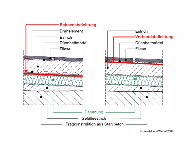 Fakten: Bei fach- und normkonformer Dünnbettverlegung in Nassräumen gemäß aktueller DIN 18157 Teil 1 bis 3 April 2017 mit Keramikbelägen im „Buttering-Floating“-Verfahren und beidseitigem Dünnbettmörtel DIN EN 120004 in Verbindung mit Verbundabdichtung (AIV), (siehe rechtes Detail) entsprechend dem allgemein bauaufsichtlichem Prüfzeugnis (abP) sowie geeignete Untergrund-Konstruktionen unter Berücksichtigung der einschlägigen Regelwerke, wie z. B. ZDB-Fliesen-Merkblätter des Zentralverband Deutsches Baugewerbe o. ä. und Produkthersteller-Verarbeitungsvorgaben, gibt es keinen zu entwässernden Sickerwasser-Flüssigkeitsanfall im Fliesenbelagsaufbau. Bei Regelwidrigkeiten handelt es sich um Verfliesungs-Baumängel den die Fliesenfirma laut Bauvertragsrecht ggf. kostenneutral zu beseitigen hat. Vorteil der praxisbewährten Dünnbett-Verfliesungs- und Verbund-Abdichtungsmethode ist u. a. der kraftschlüssige hygienische und Stagnationswasser freie Materialverbund mit geforderter Haftzugfestigkeit von mind. 1,5 N/mm².