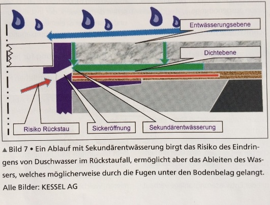 Ziffer 5.4 Stand 2016 sinngemäß: Zu bevorzugen sind Einbauteile mit einer Sekundärentwässerung. Die Einbindung hat so zu erfolgen, dass diese auf der Dichtebene des Bodeneinlaufs sichergestellt ist. Sollten Bodeneinläufe diese Kriterien nicht aufweisen (Rinnen mit Stehpfalz ö. ä.), so kann es bei längerer Einwirkzeit von Staunässe durch Dusch- oder Reinigungswasser mit Belagsverfärbungen (samt Silicon) sowie chemischen und physikalischen Unverträglichkeiten mit den angrenzenden Materialien kommen.